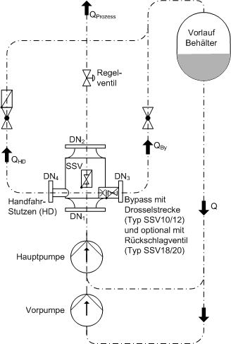 | Spezial-Freilauf-Rückschlagventile sind Pumpenschutzarmaturen, die verhindern, dass der geforderte Mindestförderstrom zu keinem Betriebszustand unterschritten wird. Sie schützten selbsttätig Kreiselpumpen vor Schäden, die beim Fahren im Schwachlastbereich durch Teilverdampfung des Pumpeninhalts bzw. instabiler Strömungsverhältnisse auftreten können. Die Ventile verfügen über einen Einlass- DN1 und einen Auslassflansch DN2 für die Förderung in Hauptrichtung - zum Prozess. Für die Mindestmenge befindet sich ein zusätzlicher Stutzen an dem Ventil - der Bypass- oder Mindestmengenstutzen DN3. Sobald der Hauptförderstrom einen bestimmten Wert unterschreitet, öffnet das Ventil seinen Nebenauslass (Bypass) so weit, dass stets die erforderliche Pumpenmindestmenge abgeführt werden kann, selbst wenn die Flüssigkeitsförderung in Hauptrichtung komplett eingestellt wird. Das Freilauf-Rückschlagventil öffnet und schließt automatisch den Nebenauslass entsprechend der Fördermenge in Hauptrichtung. Diese mengengesteuerte Regelung arbeitet ohne zusätzliche Hilfsenergie. Im Bypass erfolgt über eine mehrstufige Drosselstrecke (kavitations- und geräuscharm) ein Herabsetzen von Druck und Fördermenge auf die erforderlichen Mindestmengenbedingungen. Durch das integrierte Rückschlagventil in Hauptförderrichtung wird ein Rückwärtslaufen der Pumpe sicher vermieden. | |